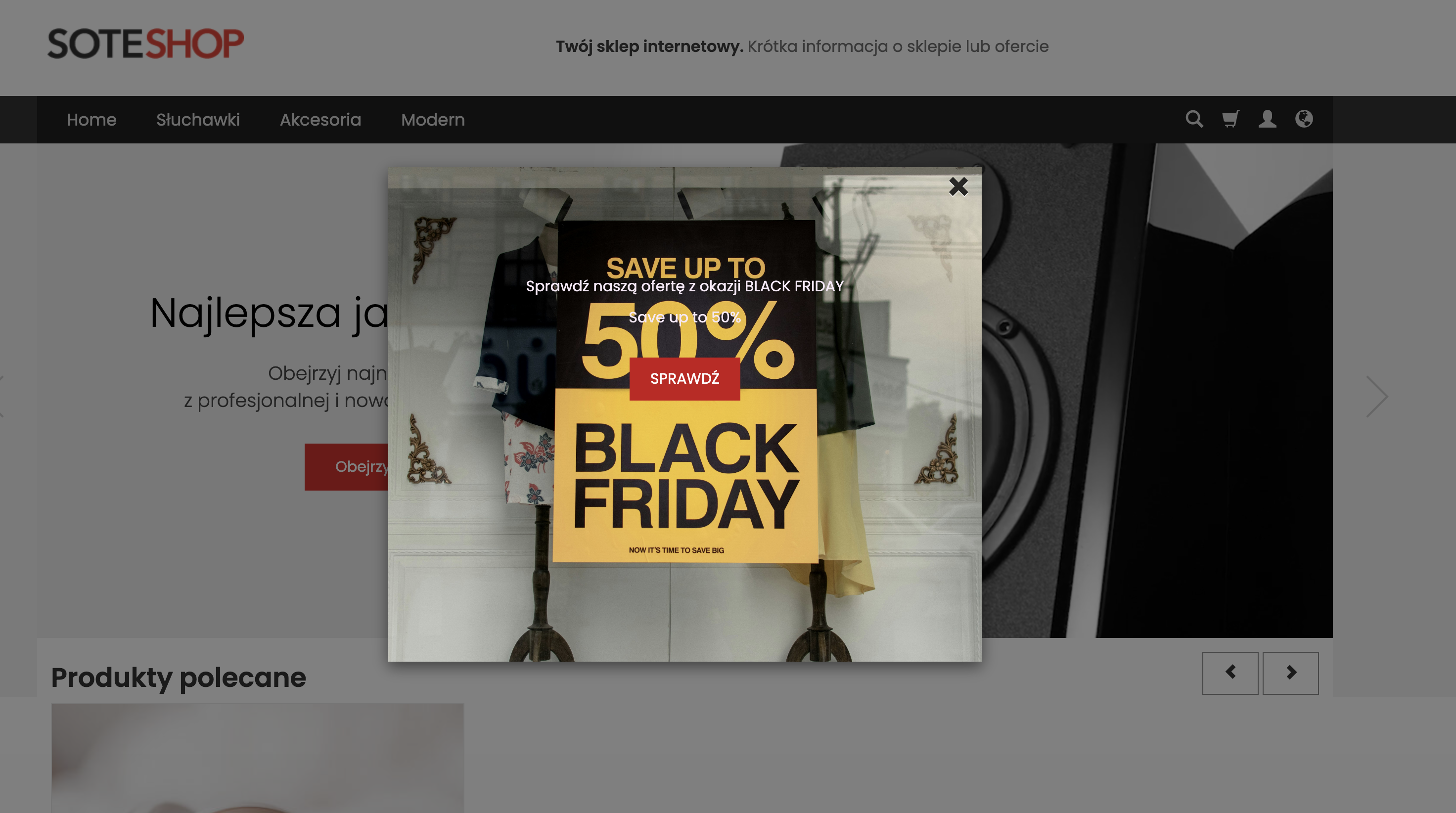 This Application allows you to display the pop-up window when you enter the store website. The mechanism uses cookies and allows for setting up advertising and informative campaigns for the store clients. You can use the graphics and text in the background of the backlit window, this offers a wide range of adaptation options to individual needs of the sellers.